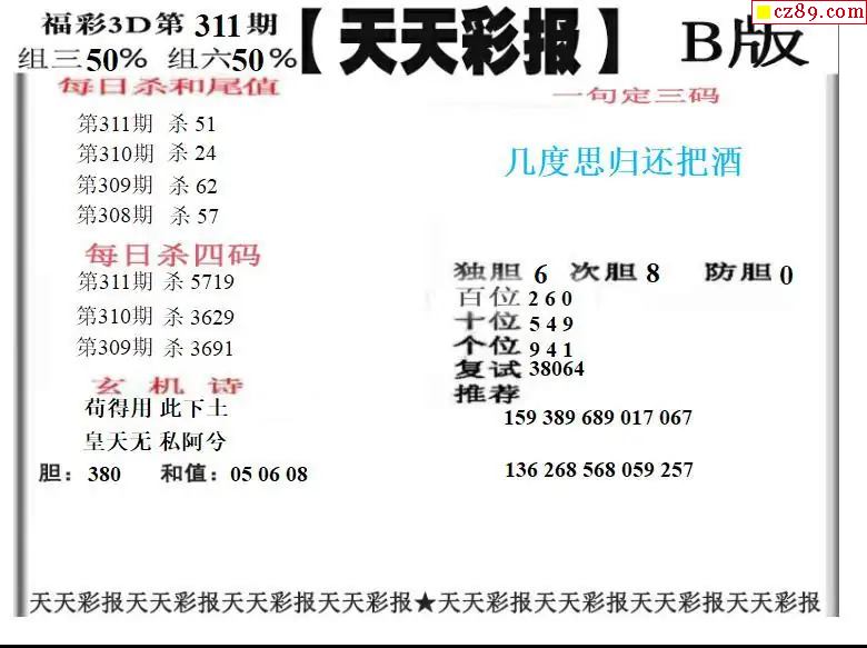 福彩3D2025311期天天彩报A版 天天彩报B版-【3D开机号】今天_3d开机号和试机号_最新排列三开机号-3D福彩